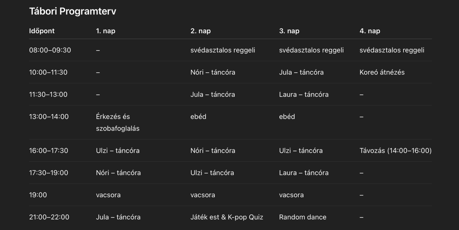 Az alábbiakban olvashatjátok el a tájékoztatónkat, valamint ellenőrizhetitek a névsort és a hoznivalók listáját. Ha bármilyen hibát találtok, kérjük, írjatok nekünk egy e-mailt – 24 órán belül javítani fogjuk.
